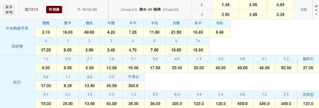 竞彩官方为本场比赛开出了1.48(瑞士胜)4.05(平局)4.85(瑞典胜)的赔率组合,